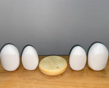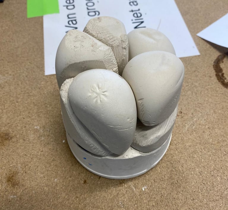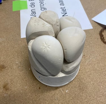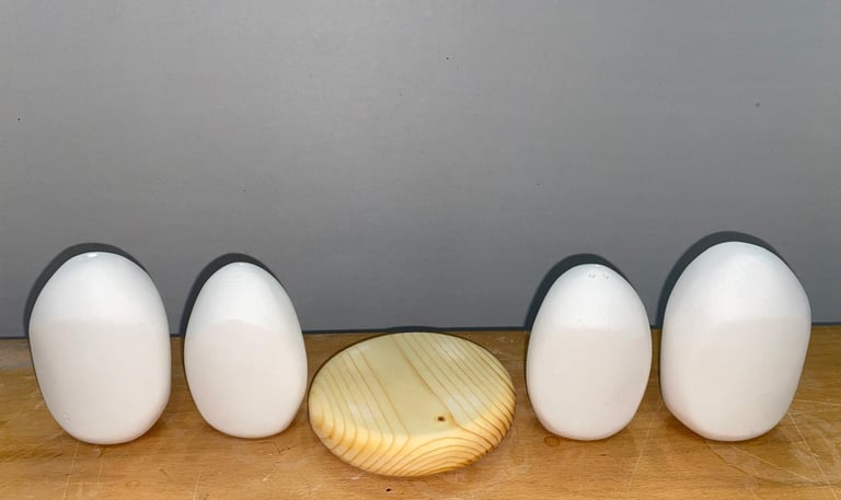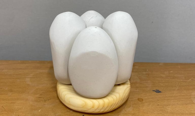 Using the IPO design process, I began experimenting with forms by casting plaster into balloons. This allowed me to create organic, rounded shapes that I could refine into the desired curves and surfaces. These plaster vessels were then combined with a wooden plateau, arranged in a circular composition that emphasized harmony and flow.