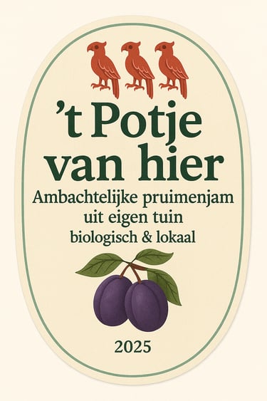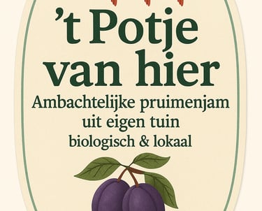 For my brother’s homemade plum jam, ’t Potje van Hier, I designed a logo that combined local identity with a traditional look. The logo needed to represent authenticity and heritage, while also being versatile enough to fit on different types and sizes of jam jars.